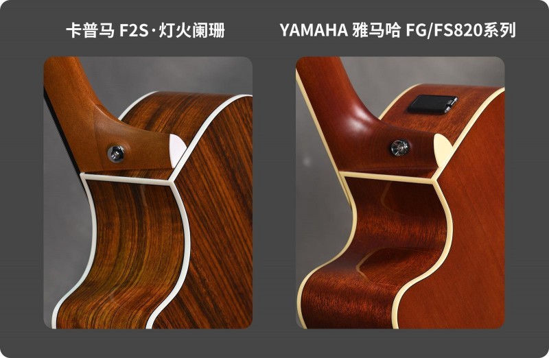 卡普马F2S指板材料为玫瑰木,FG/FS820系列为胡桃木。卡普马F2S的指板为“灯火阑珊”主题镶嵌,雅马哈FG/FS820为经典的圆音点镶嵌。