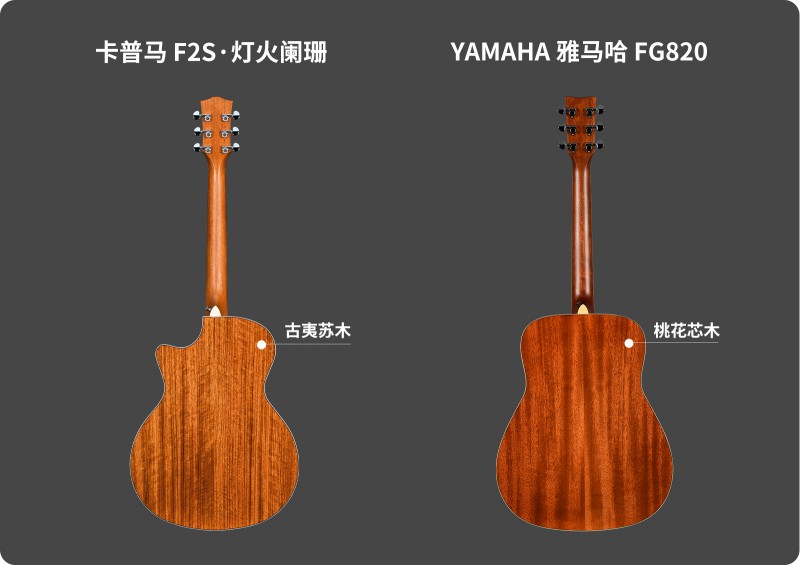 雅马哈官方资料显示其使用的是那都木,而卡普马F2S则选用了行业内更经典的桃花芯木,这样选择,是因为桃花芯木能带来非常温暖、饱满的中频音色,尤其适合弹唱,声音感染力强。这主要是音色取向的不同,您可以根据自己喜欢的风格来选择。