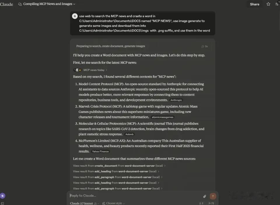 { "mcpServers": { "word-document-server": { "command": "python", "args": ["/你的项目路径/word_mcp_server.py"] } } }重启 Claude,就能在对话中调用 Word 功能了!如果大家不熟悉MCP以及配置教程,我之前在公众号也写过详细的介绍,大家可以参考一下: