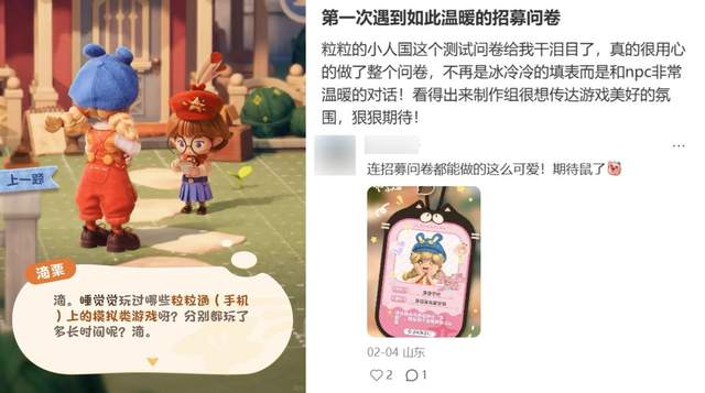 这款游戏把治愈做到了极致,就连游戏的招募问卷也处处透露着温暖。跟npc对话了解小人国的生活指南,关心你的每一个需求,还会给玩家发放定制的“小人国版工牌照”。这不仅让我心里疯狂好奇:“问卷都做得这么用心,游戏本体得惊艳到什么程度啊?”