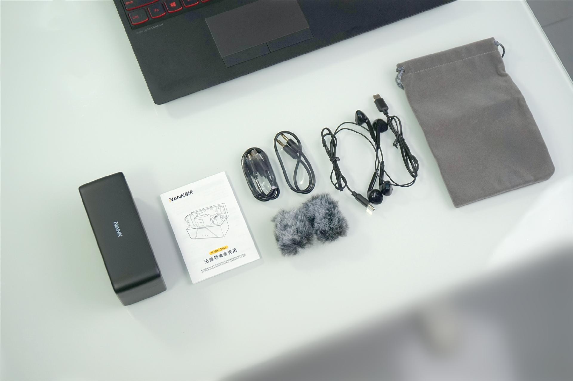 将南卡Qmic领夹麦克风的配件拿出来,特别的齐全。除了麦克风的的发射器和接收器之外,还配备有Type-C转接头、Lighting转接头、3.5mm音频线、两副Type-C耳机、毛绒防风罩、充电线、收纳袋和说明书。