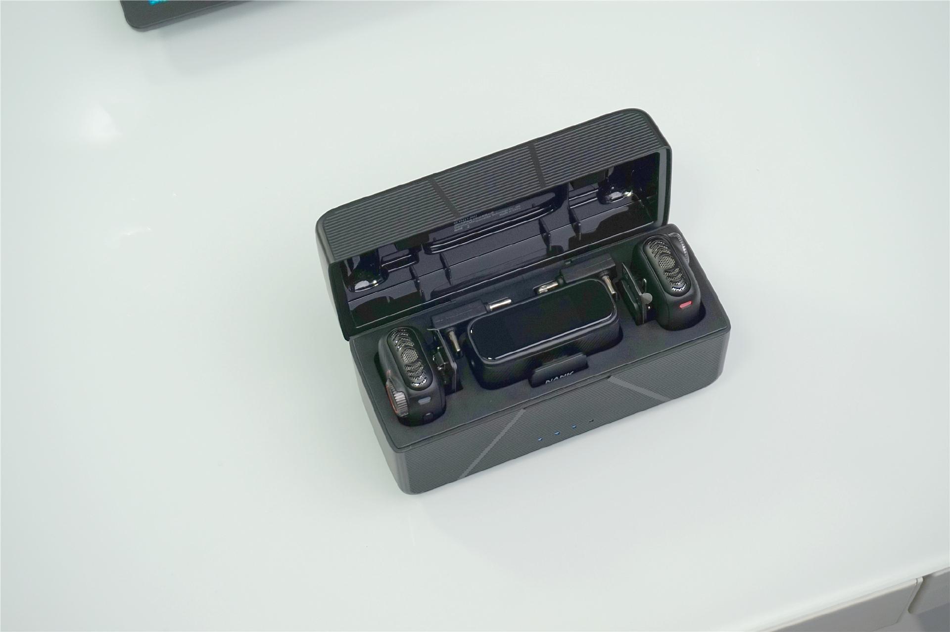 这个长方形的盒子既是收纳盒,又是充电仓。平时不使用时,将接收器与发射器放入其中就可以充电。另外,就连两个转接头也是在其中收纳的,真的是一物多用。