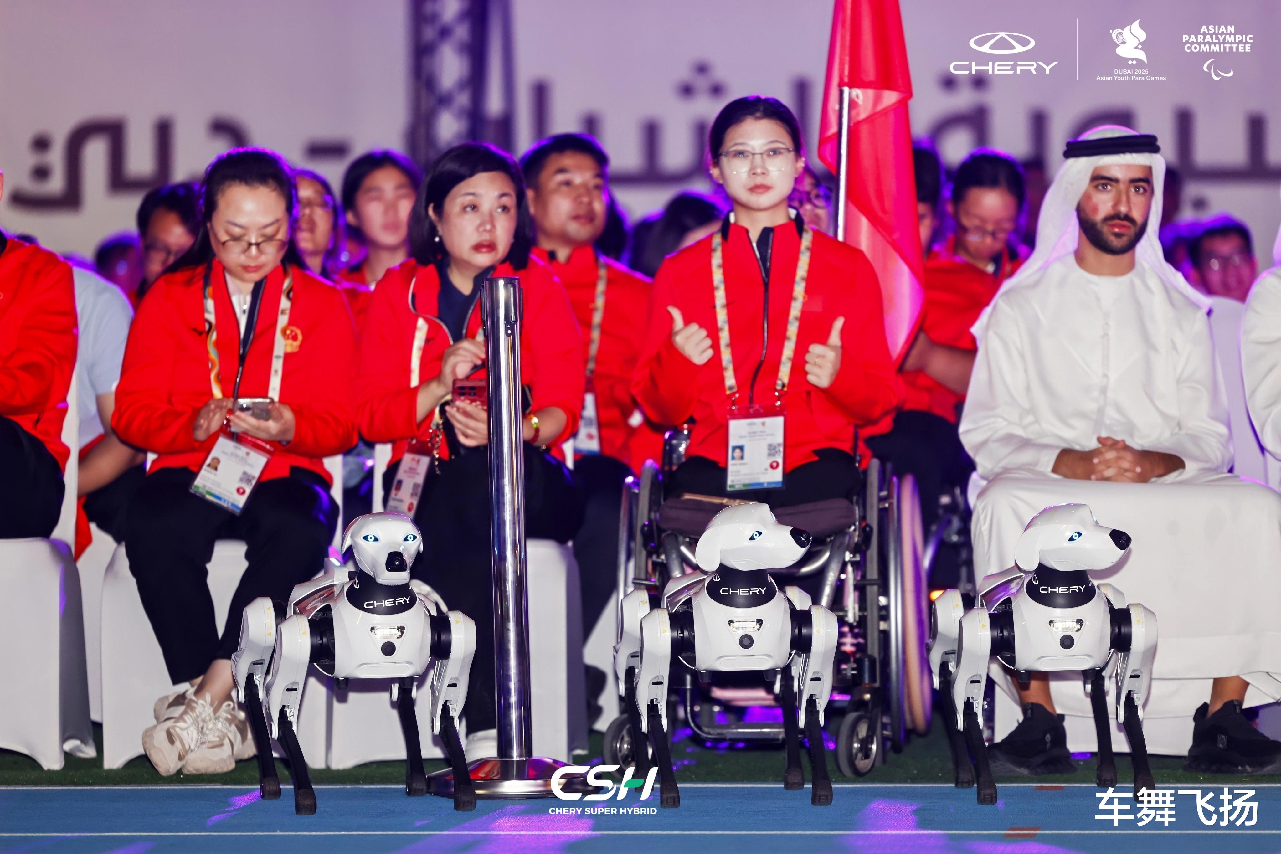 在开幕式上,智能机器人“墨茵”作为本次赛事奇瑞指定发言人,与亚洲残奥委员会主席 Majid Rashed 及迪拜皇室成员亲切互动,共同为本届亚青残运会启幕。机器狗 (Argos) 则以“代表团领队伙伴”的身份陪伴运动员列队入场,收获阵阵喝彩。“墨茵”更是在与会嘉宾的交流中使用中文、英语、阿拉伯语、马来语等9种语言与嘉宾及观众交流,展现了奇瑞科技实力。