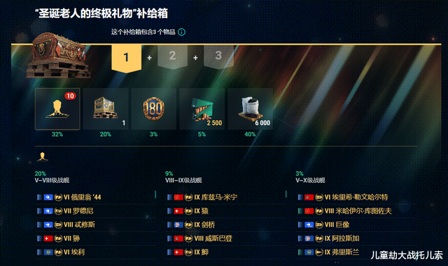 今年活动还新增了“圣诞老人的终极礼物”补给箱,这个箱子只在12月限时上架,且只能用现金购买,稀有船和高级船的爆率更高。其中10级船爆率3%,9级船9%,“金色礼物”补给箱20%,金币掉落数量为2500。