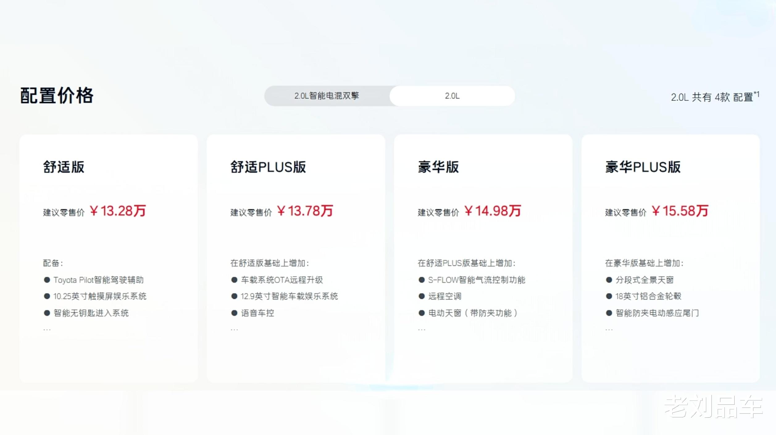 配置推荐,个人觉得性价比最高的是2.0L智能电混双擎豪华版,价格15.98万元,实际落地可能在15万元出头。内饰上是仿皮座椅,12.9英寸中控屏和L2级辅助驾驶,配置比入门版更全面。油耗只有4.56L/100km,比汽油版更省油。入门油电混合版虽然便宜点,但是织物座椅和舒适性配置比较基础,比尊贵版覆盖的核心功能,更适合注重实用性和智能配置的买家。