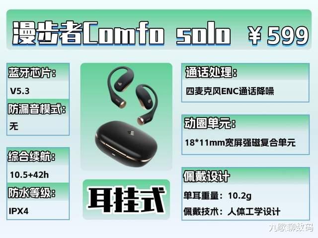 佩戴舒适度是比较好的,耳挂是天鹅颈设计,戴眼镜的时候,不会跟眼镜腿打架,戴久了也不觉得硌;重量上,单只才 9.5 克,特别轻,再加上耳挂的黄金角度拐点设计,戴一下午耳朵也不酸不压。