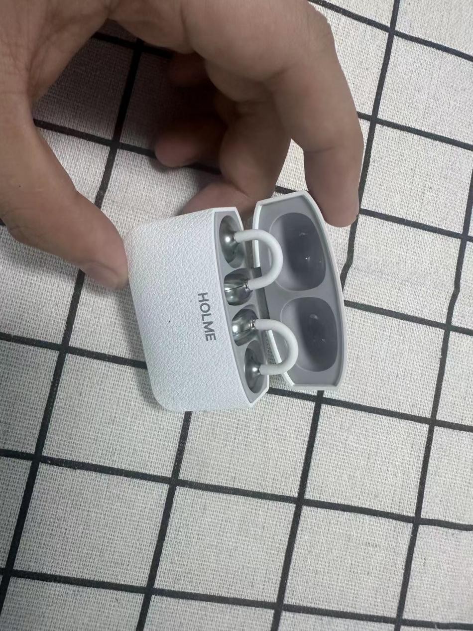佩戴体验:这款虹觅Clip Pro在佩戴设计上很特别,它前高后低的采用2.5mm错位设计,上耳后呈现前高后低的状态,能更好契合耳形,让佩戴更稳固;同时电池仓采用∠12弧面耳托设计,能更好的贴合耳背提升舒适度。而且单耳仅重4.5g,长时间佩戴也不夹耳。