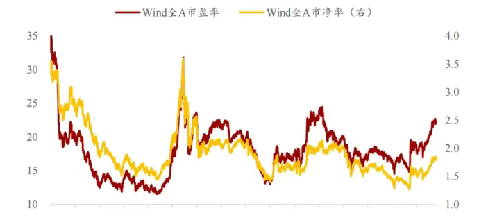 全A的市盈率已经不低了,快到上一波的高点,离15年还有挺远。市净率还可以,很多大盘股没怎么涨,后面要切换了……