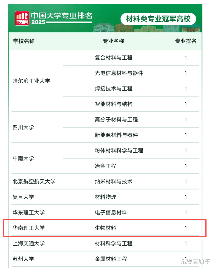 如此看来材料专业的就业逻辑已经彻底改变。它不再是“一锅端”的统一赛道,而是高度细分、精准对接产业需求的结构性机会。谁更贴近前沿方向,谁就更具就业竞争力。这正是华南理工大学材料相关专业近年来持续走强的重要原因。作为工科底色极强的高校,华南理工在材料领域的布局并非“追热点”,而是长期深耕与系统推进。在软科2025中国大学专业排名中华南理工生物材料专业位列全国第一,进入材料类冠军高校行列,而在教育部学科评估中也一直稳居前列。