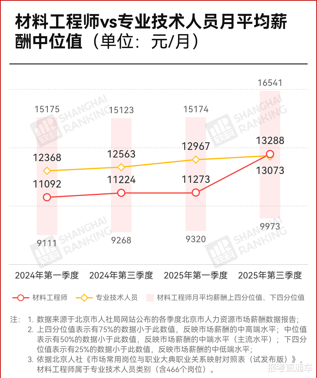 最新发布的《2025年北京市人力资源市场薪酬水平报告(三季度)》显示,在专业技术人员这一大类中,材料工程师的月平均薪酬中位值达到13288元,首次超过专业技术人员整体平均水平。更进一步看,金属材料工程技术人员、材料成形与改性工程技术人员的年薪中位值已突破20万元门槛。这并不是个例,而是一个明确的信号——材料类岗位,正在成为高薪技术岗位的重要组成部分。