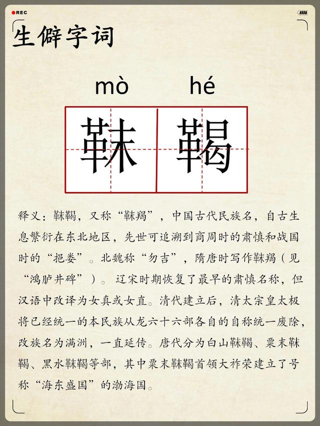 比如靺鞨——最早叫肃慎,后来叫挹娄,又称勿吉,直到隋唐改叫靺羯才渐为人知。当然靺鞨的一支后来被汉人译作女真,这才名声大噪。