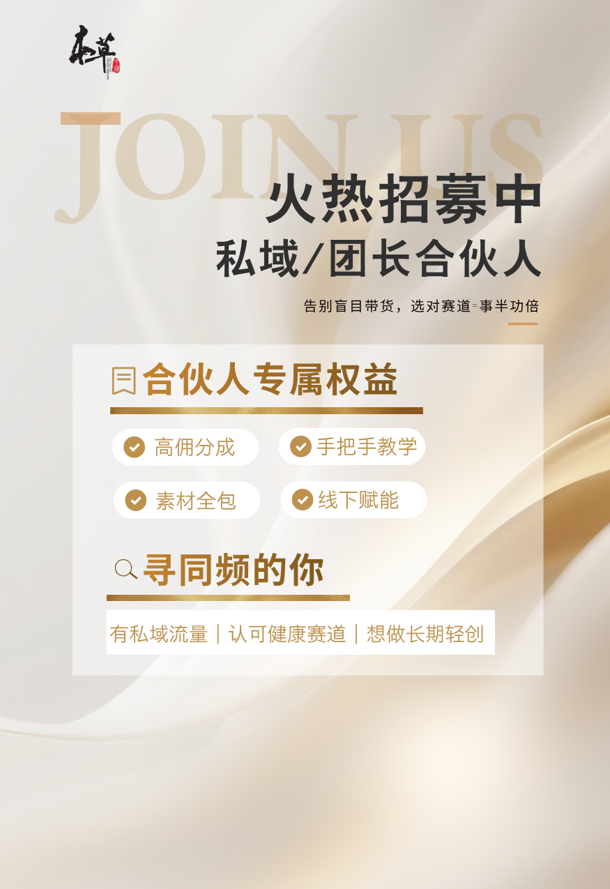 今天,一个机会窗口正式开启。国内功能性食品科技品牌——本草元气,正式启动 “私域团长合伙人” 火热招募计划。我们提供的,不仅是一款产品,更是一张驶向蓝海核心的 “价值航海图” 、一套能让你告别盲目带货、实现事半功倍的 “科学装备系统” 。我们邀请有远见、有行动力的你,共同开拓这片充满无限可能的未来市场。