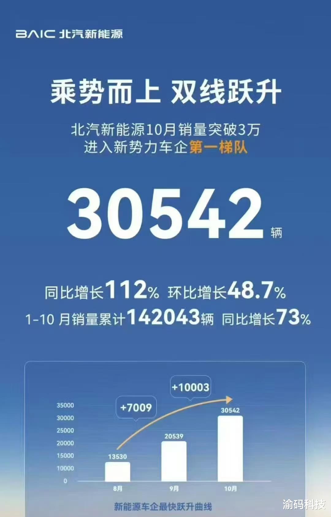 11月1日,北汽新能源发布最新消息:10月份单月销量正式突破30542台,同比增长112%,环比增长48.7%,创下品牌成立以来的最高交付纪录。