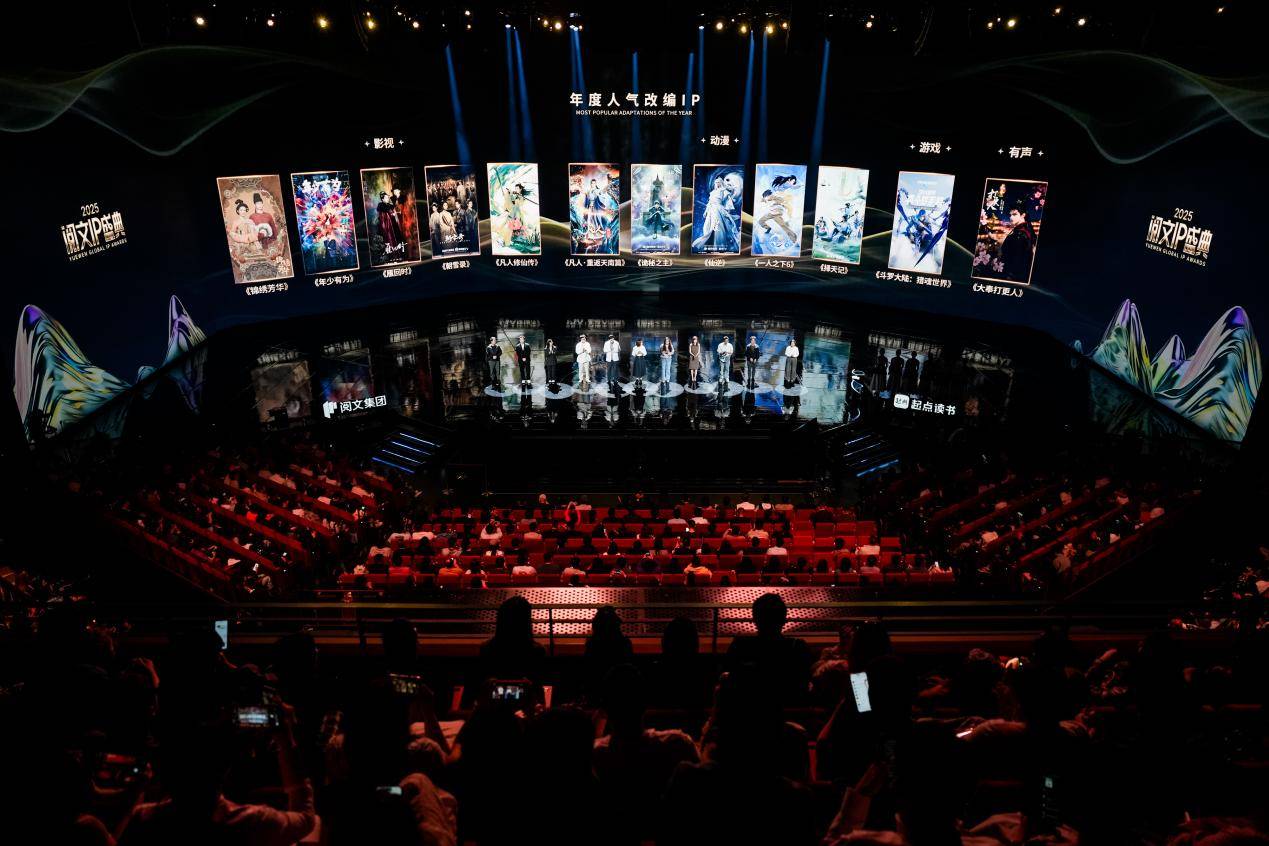 作为“IP开发风向标”,阅文IP盛典榜单涵盖动漫、影视、游戏、衍生等全产业链板块。据云合数据,2025年上新长剧累计有效播放霸屏榜前10位中,有5部改编自阅文IP;全网动漫播放霸屏榜TOP10中,高达9部改编自阅文IP。此次入选“年度人气改编IP”的12部作品中,影视剧《凡人修仙传》《锦绣芳华》《年少有为》《雁回时》《朝雪录》掀起追剧热潮,动画《凡人·重返天南篇》《诡秘之主》《仙逆》《一人之下6》《择天记》霸榜热门榜单,游戏《斗罗大陆:猎魂世界》上线首月流水突破3亿元,有声作品《大奉打更人》成全网首部播放量破百亿的有声剧,展现阅文IP的跨媒介影响力。
