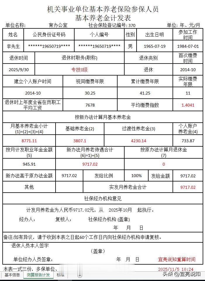 1、李先生1965年7月出生,1984年7月参加工作,2025年9月退休;退休时的年龄为60岁零2个月,个人账户养老金和职业年金的计发月数为137.8个月。视同缴费年限为30.25年,累计缴费年限为41.25年;暂时按2024年的7678元计算预发养老金。