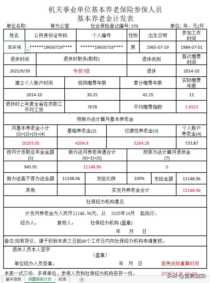 李先生副高7档的基本养老金10203.05元的计算详细情况,请参见我2025年11月2日的文章。