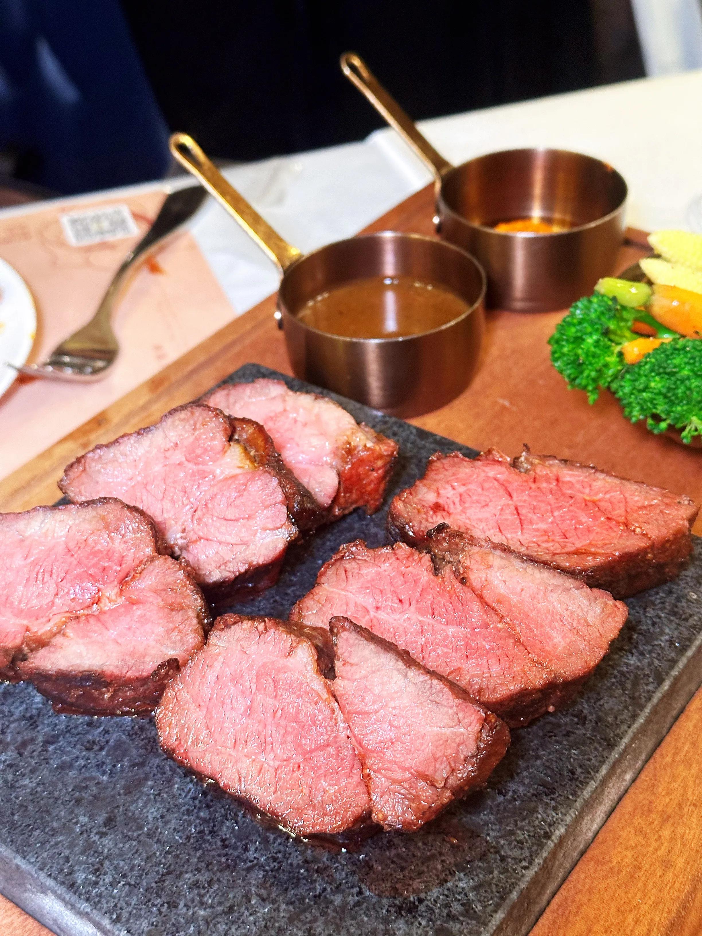 他家最让人放心的就是牛排品质——不管是爱嚼劲儿的选西冷,还是喜欢软嫩口感的挑菲力,煎得都特别对味。外皮带着淡淡焦香,一刀切下去能看到肉汁锁得很足,吃着一点不柴,而且能尝出是正经原切肉,不是那种碎肉压的合成品,一口就能吃出家常馆子比不了的扎实感。