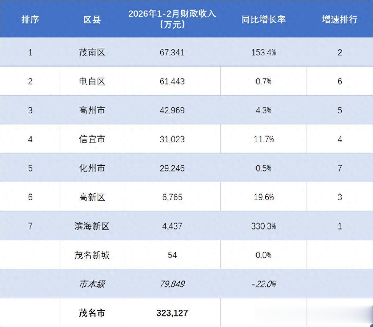 根据统计部门公布的数据,2026年1-2月份,茂名全市共实现地方财政收入32.31亿元,较上年同期增长9.7%,增长势头强劲!其中市本级收入7.98亿元,同比下滑22.0%;区县收入合计24.33亿元,同比大涨25.2%。