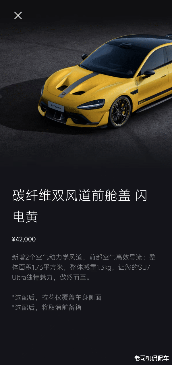2025 年 2 月,小米发布 SU7 Ultra 量产版,同步推出选装价 4.2 万元的碳纤维双风道前舱盖(俗称挖孔机盖),官方宣传该设计复刻原型车造型,具备双风道空气动力学导流、辅助散热、提升行驶下压力等赛道级功能,雷军也曾公开强调该机盖 “不只是改外观,内部结构也做了改动”。