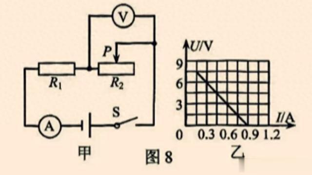 12.如图8甲,电源电压恒定不变,R1为定值电阻,R2为滑动变阻器。闭合开关S,R2的滑片P从最右端滑至最左端的过程中,电压表与电流表的示数变化关系图像如图8乙,则下列说法正确的是( )