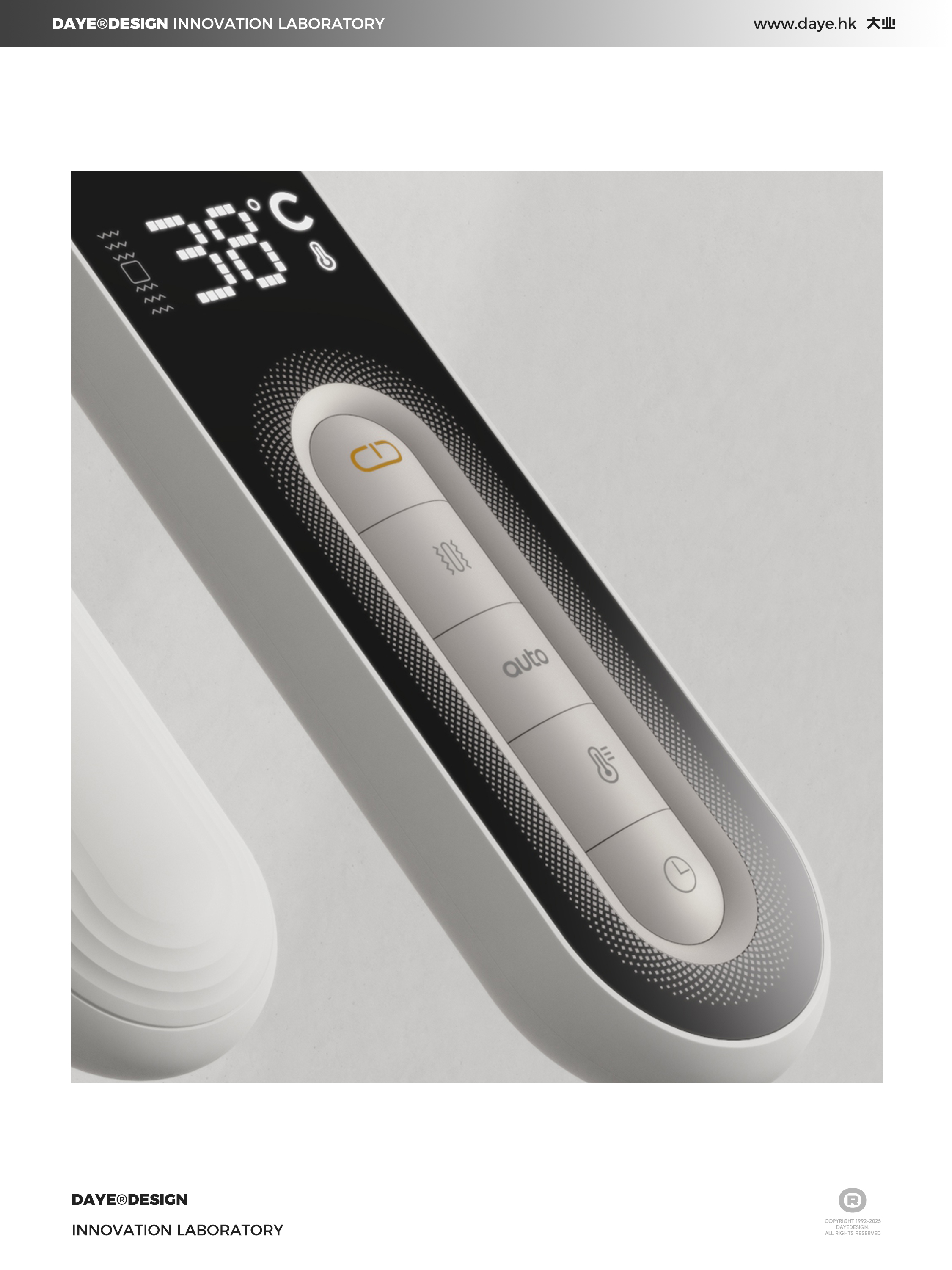 配色风格以白色为主色调,呈现出简洁、干净的气质,符合当下简约时尚的审美潮流。局部点缀的黄色元素,如侧边的小块黄色区域,为整体较为素雅的外观增添了一抹亮色,起到了视觉焦点和点缀装饰的作用,使产品更具活力和辨识度。按键布局合理,操作区域明确,用户可以通过简单的按压操作来切换不同的工作模式、调节温度。