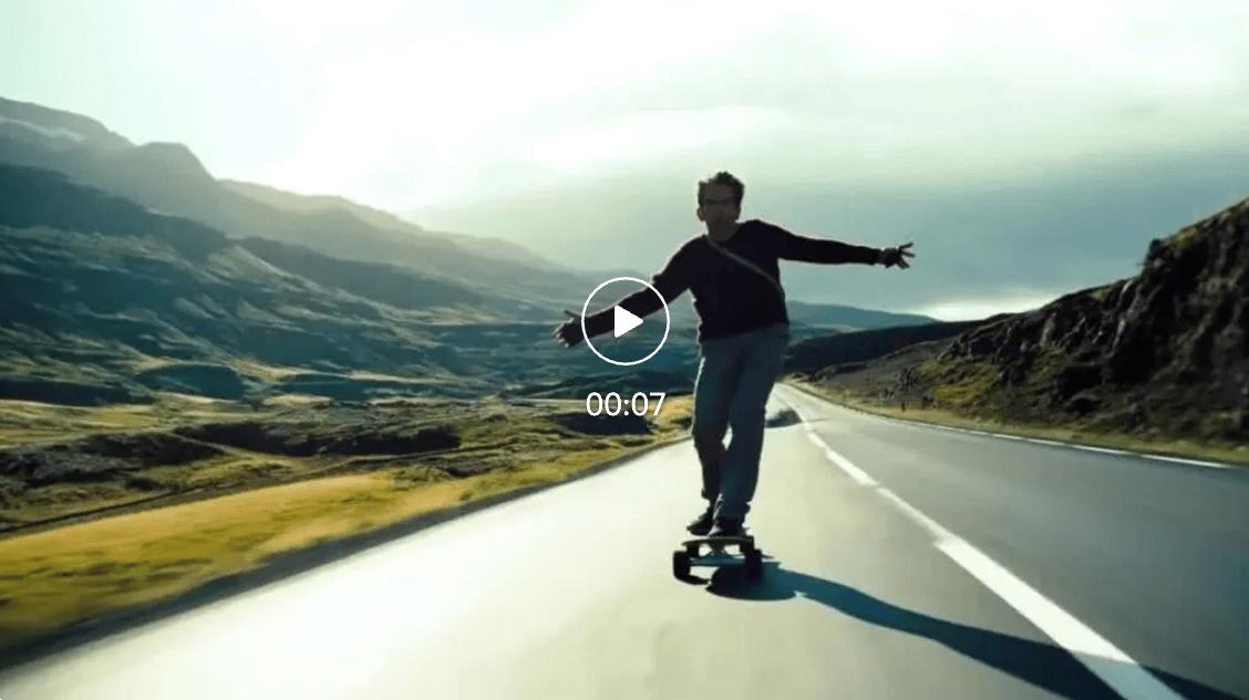 提示词:画面是一名穿着红色上衣、灰色裤子的男子在空旷的公路上滑板的场景,公路周边是草地和低山。男子通过左右摇摆的方式不断加速,展开手臂沿着公路不断滑行。背景声音为高速滑行时风吹过的呼啸声。