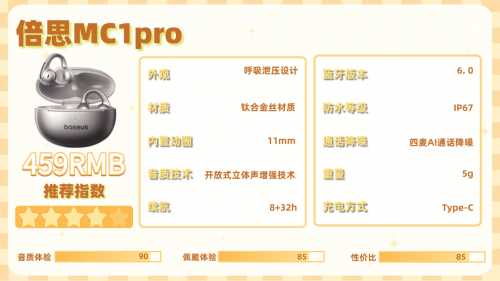 倍思MC1 Pro是主打运动的开放式耳机,磨砂外壳手感好,机身小巧便携。它采用呼吸泄压设计加钛合金丝加持,单耳仅5g,佩戴轻盈舒服,日常通勤和运动健身都能稳稳贴合耳廓,不易掉落。