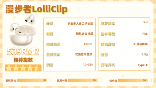 漫步者LolliClip机身设计简约,适配日常多种场景。它采用多曲率人体工学软梁与镍钛合金材质,单耳6.5g虽算轻盈,但部分用户佩戴会有轻微坠感,跑步时还易产生空气噪音,更适合静态或轻度活动场景。