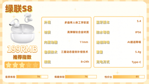 核心配置,内置11mm双磁单元,虽有硬件基础,但受开放式设计限制,实际听感中高频细节稍显模糊,低频表现偏弱,不过开启降噪后自适应音效补偿能强化低频表现。收音方面采用双耳6麦双馈降噪系统,能削弱空调运行等环境噪音,但对人声过滤效果有限,复杂场景通话清晰度一般。续航与实用性值得肯定:单机续航8.5小时,搭配充电仓总续航可达35小时,Type-C接口充电便捷,支持10分钟快充;IPX5防水等级能应对日常汗水与小雨,运动场景也能适配。整体来看,绿联S8更适合耳型适中、追求基础功能与长续航,且预算有限的入门用户。