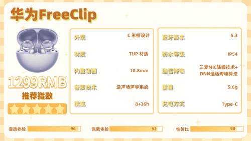 硬件配置有亮点也存局限,13mm大尺寸单元搭配沉浸空间音效,能营造不错的空间感,但高频细节解析力不足,复杂歌曲层次感欠缺,低频量感也稍弱,音质在同价位耳夹款中表现尚可。AI通话降噪对空调声等轻噪音有一定过滤效果,可在嘈杂场景下表现有限,通话清晰度一般。蓝牙6.1保障连接稳定,Type-C充电口,IP56防水防尘能应对日常出汗和灰尘。续航尤为亮眼,单机续航约8-10小时,搭配充电仓总续航可达32-35小时,彻底告别电量焦虑。整体来看,它适合追求超长续航、看重基础功能,对音质均衡度和降噪深度要求不高的实用型用户,日常轻度使用完全能满足需求。