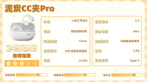 泥炭CC夹Pro的液态硅胶材质触感软乎亲肤,单耳5.8g不算沉,但耳型适配性是硬伤,耳朵偏小者佩戴易松动滑落,跑步健身时完全没法用,稳固度欠佳,IPX5防水能扛出汗和雨天。