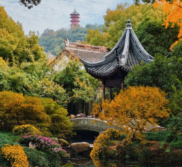 寄畅园占地约15亩,整体布局疏朗自然。步入园中,首先映入眼帘的是东西走向的长廊“郁盘廊”,廊壁镶嵌历代石刻书法,沿廊而行可抵园内主要建筑。园中央的锦汇漪水面约占全园四分之一,池水清澈,倒映惠山龙光塔与锡山山峰,形成经典借景画面。池畔的知鱼槛、涵碧亭等建筑临水而设,供游客观景休憩。