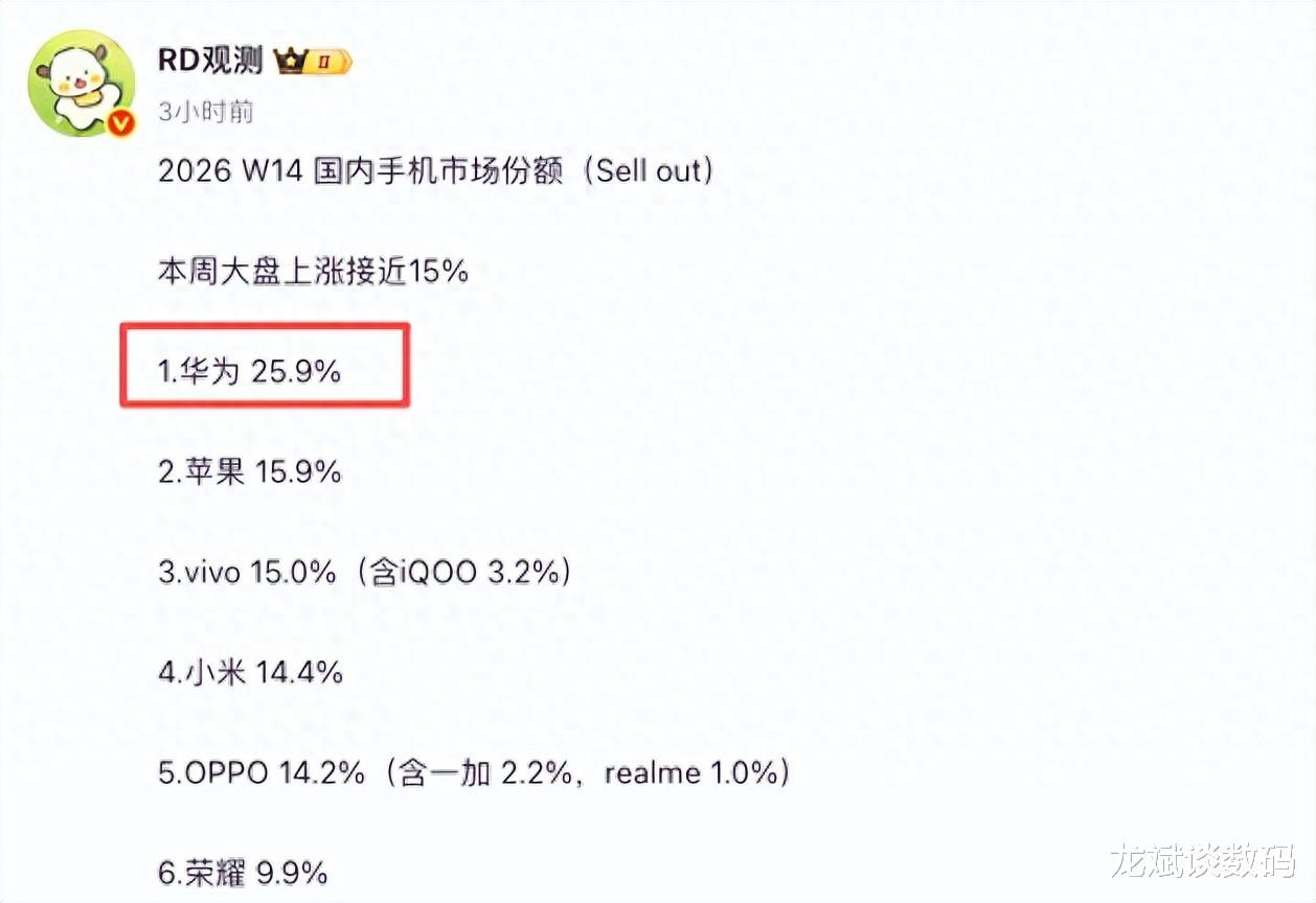 根据博主RD观测所发布的数据显示,就在W14周国内手机市场份额之中,华为手机以10个百分点反超苹果,成为了现阶段的“一哥”!对,就是直线型的反超趋势,针对于这种情况来说,还真就是略显突然了。