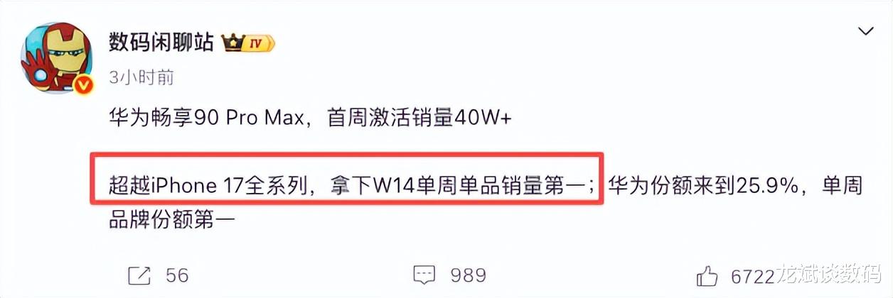 然后根据数码闲聊站的数据显示,就华为畅享90 Pro Max这款产品,就周激活量也是达到了40多万台,也是成功超越iPhone 17系列的销量成绩,一举拿下了W14周的单品销量第一,同时也是帮助华为实现了25.9%的份额占比。