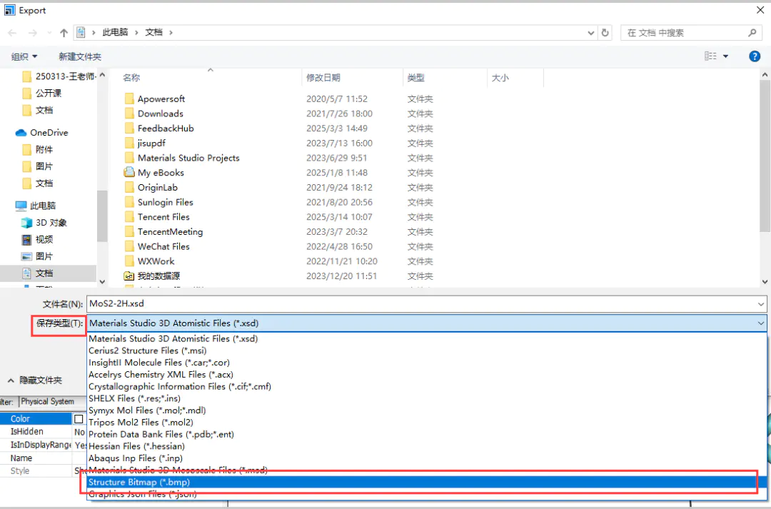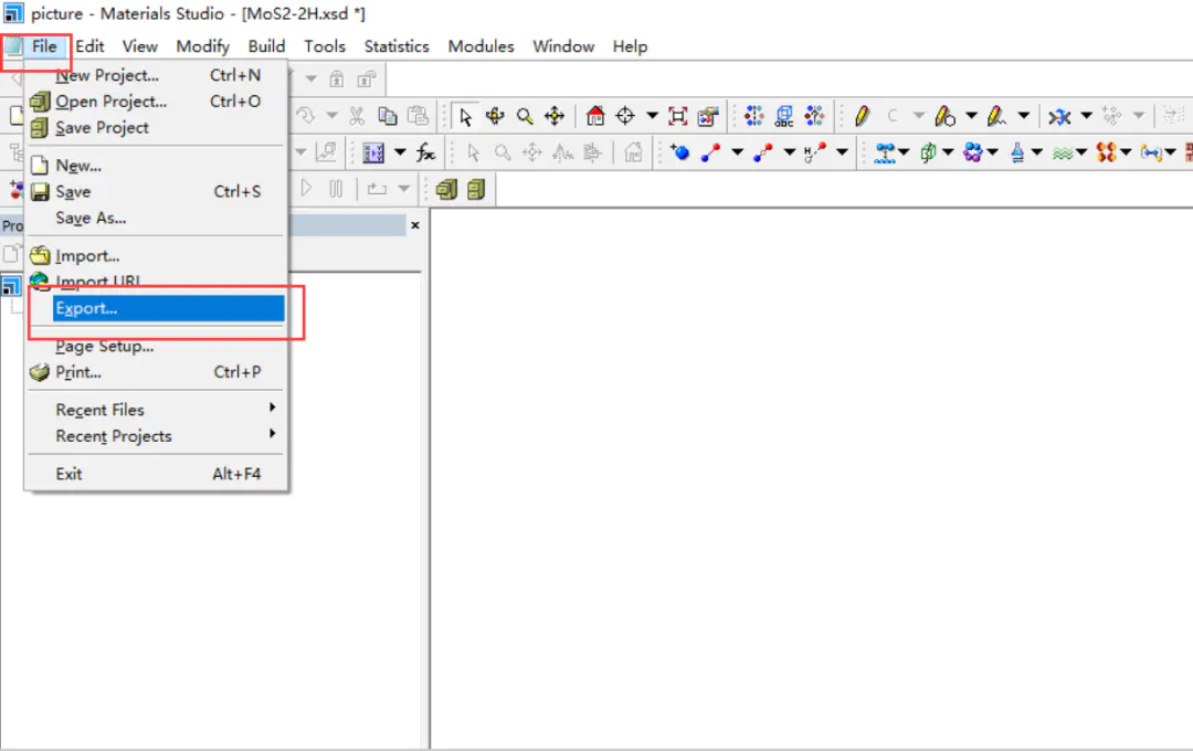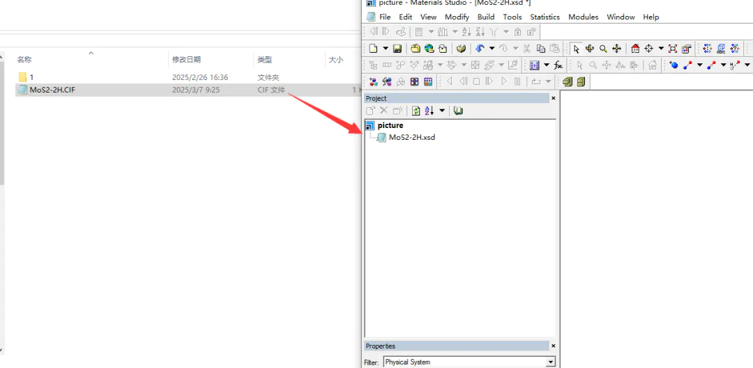 3.把需要画图的结构文件导入拖拽到Materials Studio软件内打开,示例为MoS2-2H.cif