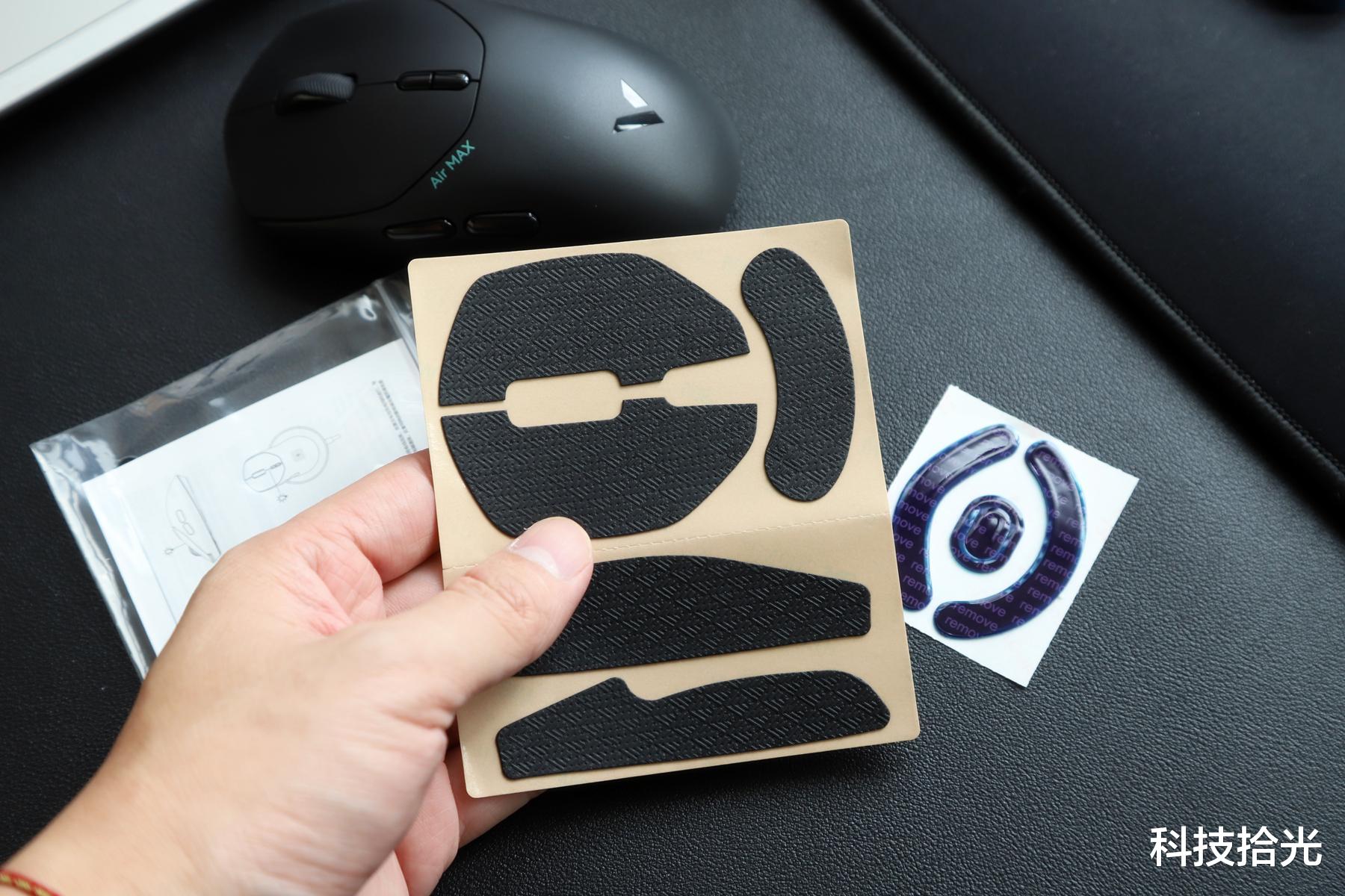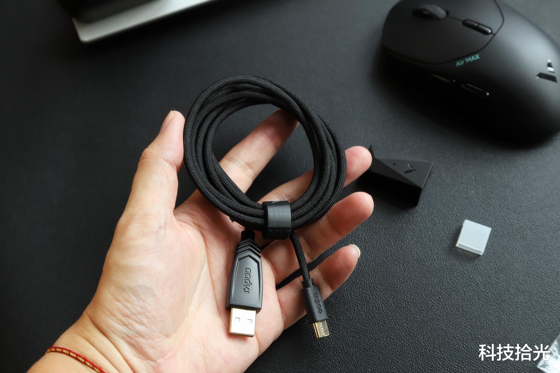 包装清单除了鼠标本体外,1.8米低阻力伞绳数据线、USB转接器、说明书、防滑贴、备用保护贴与脚贴(含侧裙与底部),也是雷柏标配。