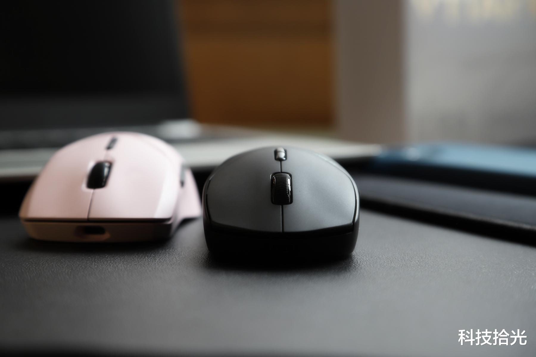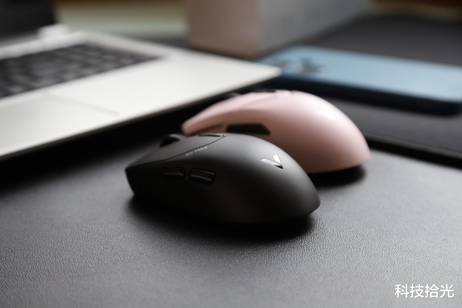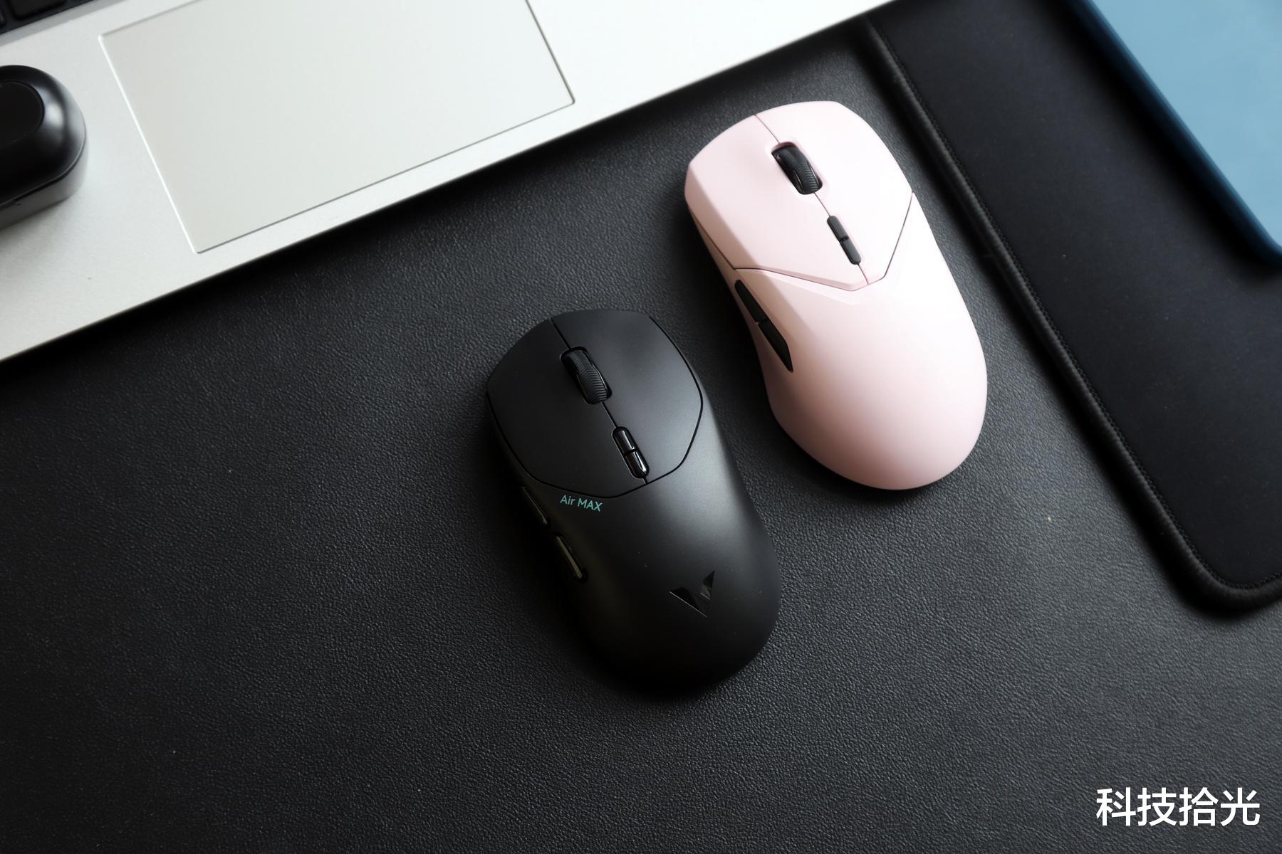 雷柏VT1Air MAX 中小手无线/有线双模游戏鼠标一共有2个配色,幽魂黑和无极白,白色款看起来会更加轻盈,黑色款质感更好,这个就各取所需了。(特别备注:粉色款鼠标是雷柏VT9Pro,也是我目前使用的主力型号,作为参考物,方便查看)