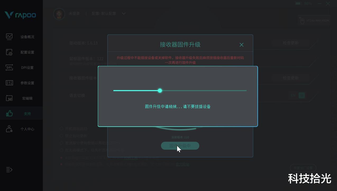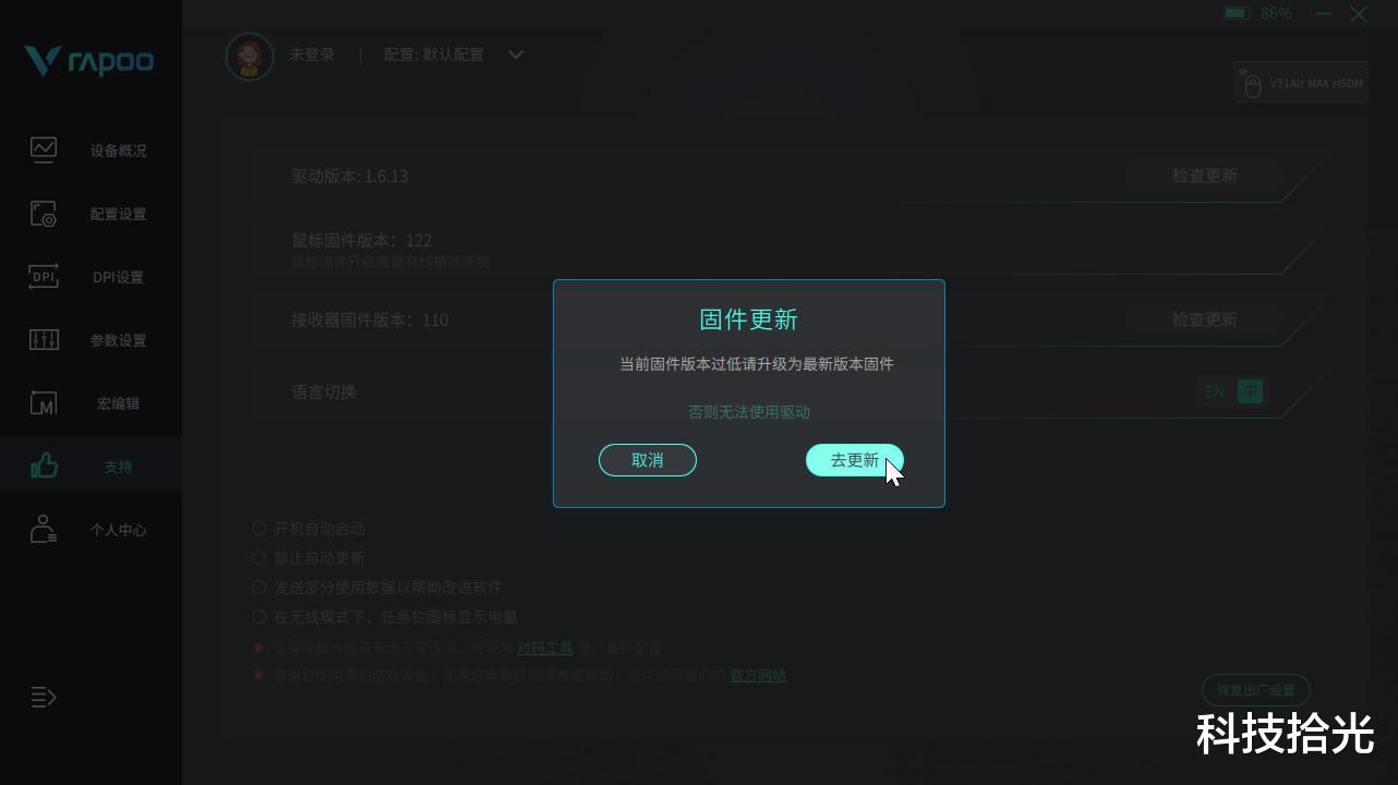 最后就是支持部分。可以对鼠标电脑驱动、鼠标固件驱动、接收器固件版本进行OTA升级,非常简单,点击+稍等一会即可完成升级操作。当然,如果你的接收器丢了或有新的接收器,也可以通过支持页面进行对码操作。