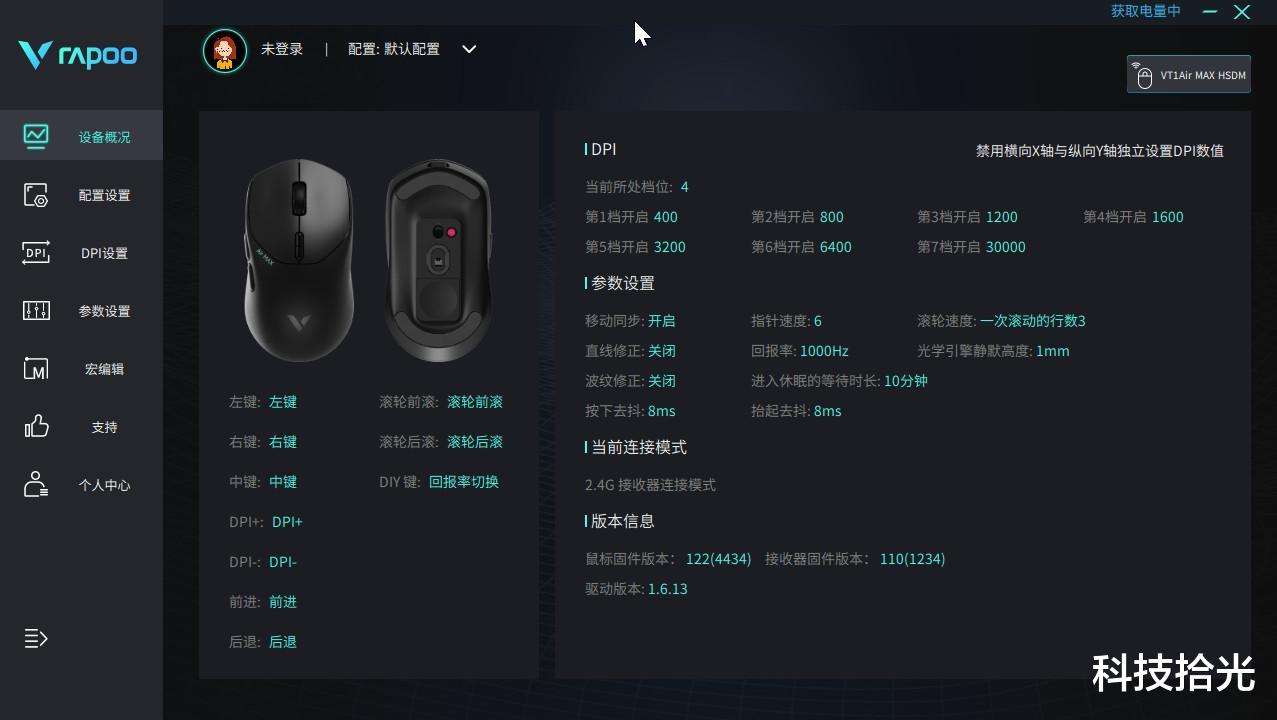 从雷柏官网搜索关键词VT1Air即可找到驱动,下载后安装也十分简单。安装完成连接鼠标即可以搭配驱动使用。首先就是设备概况,对于鼠标运行的状态可谓是一目了然,有点像是SSD硬盘的SMART表。这个驱动页是新增的,可以看到雷柏的驱动其实也再不断迭代升级。