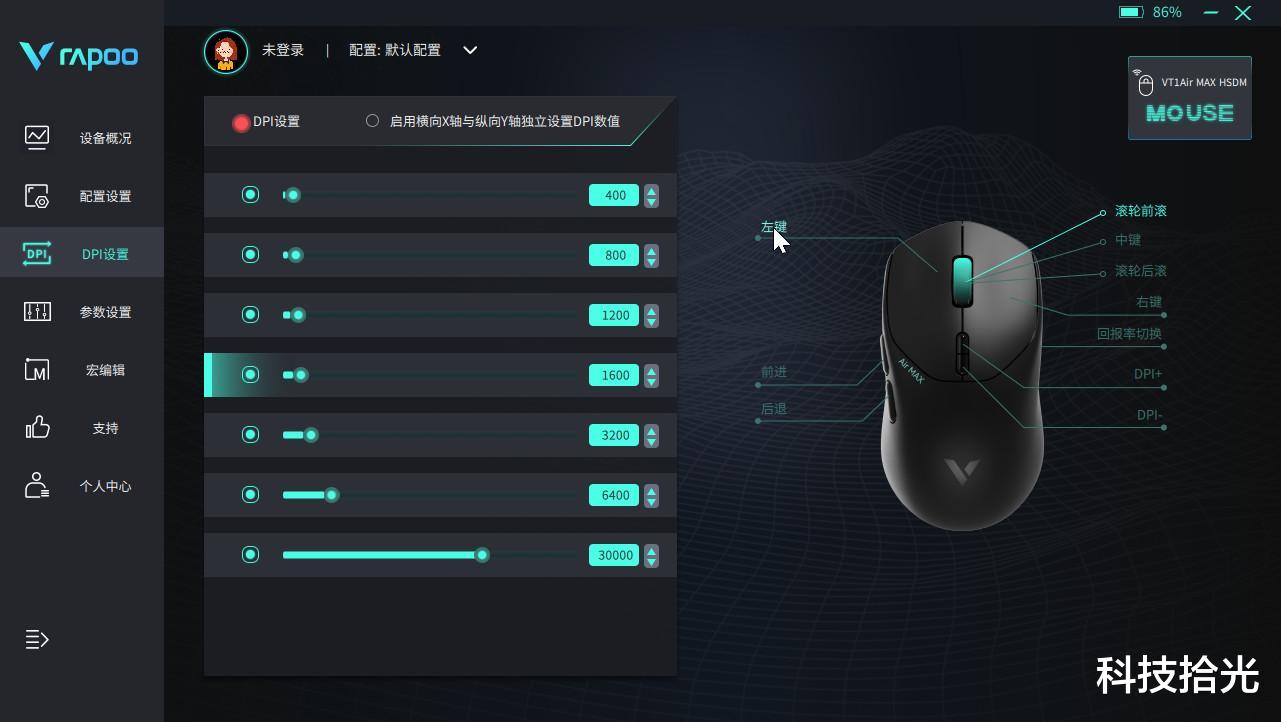 DPI设置看起来似乎和雷柏其他电竞款鼠标并无不同,点击鼠标按键与功能即可实现鼠标功能按键自定义。