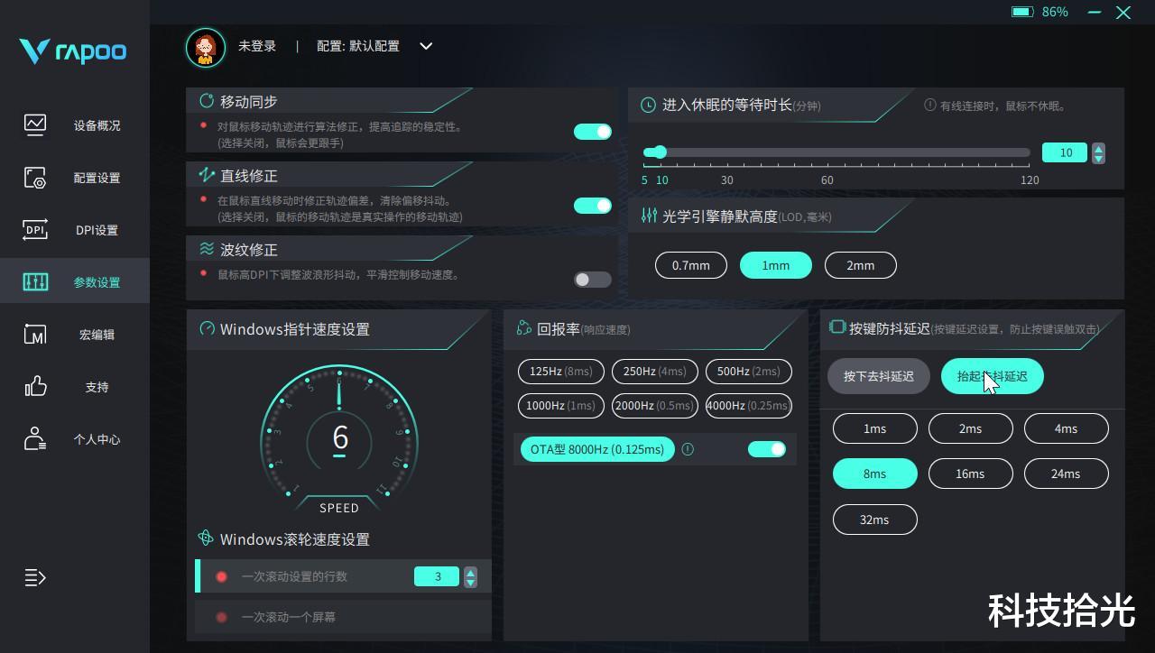 参数设置的页面看起来也比以往更加丰富强大。新增了“移动同步”、“直线修正”和“波纹修正”,针对办公软件或一些操作强的游戏可以进行操作增强。指针速度不必多说。