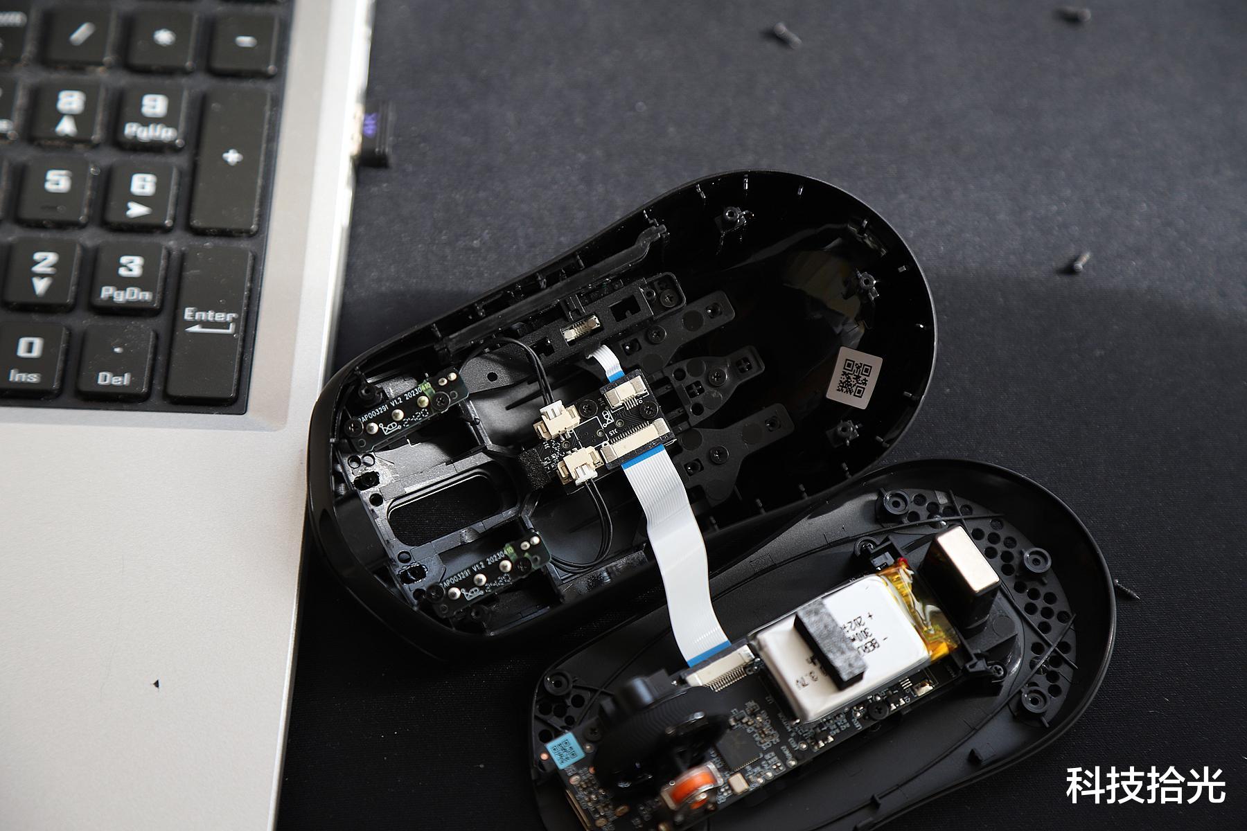其实鼠标非常好拆开,仅需要撕掉鼠标底座的垫子,拧下螺丝即可。鼠标的内部设计非常工整,几乎都是可拆卸模块,还可以看到模块都有贴二维码标。一方面是为了方便品牌部件管控,另外一方面就是预留了DIY的乐趣,比如微动手感不喜欢可以自己DIY,某个部件坏了可以自行尝试更换,乐趣多多。