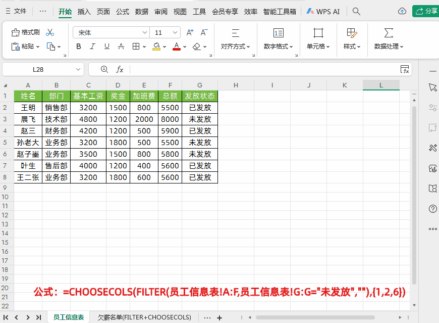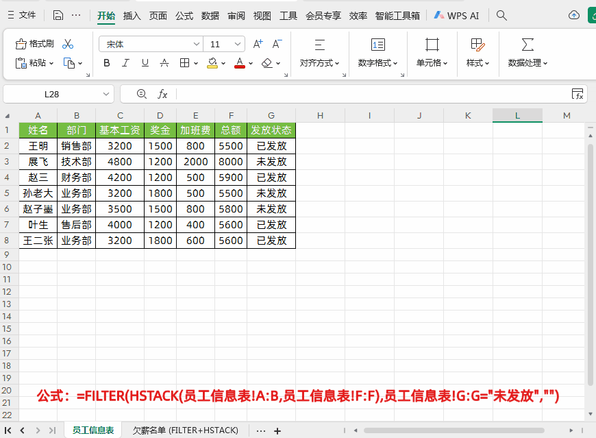 =FILTER(HSTACK(员工信息表!A:B,员工信息表!F:F),员工信息表!G:G="未发放","")然后点击回车即可