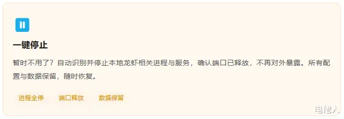 - 一键停止:立即停止本地龙虾相关进程与服务,释放端口,数据与配置保留,随时可恢复