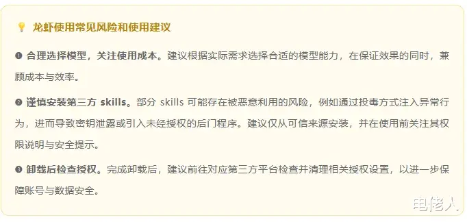 - 第三方技能安全:谨慎安装第三方技能,避免潜在风险(如投毒、后门等),优先从可信来源获取并查看权限说明
