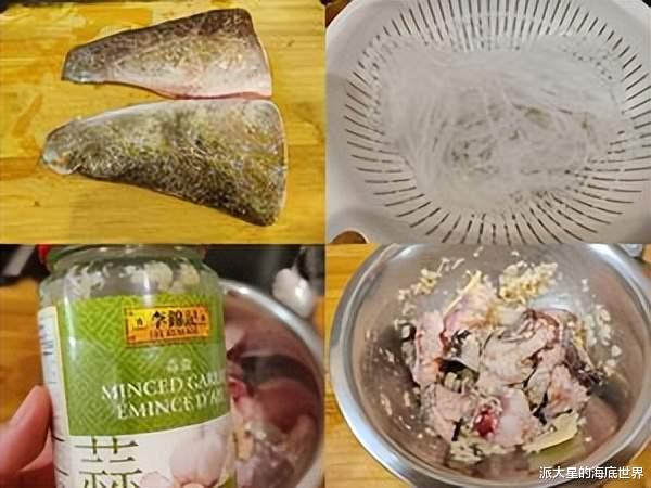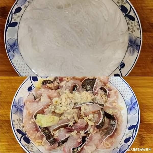 蒜蓉粉丝蒸龙趸1、粉丝用水浸软,鱼肉切片,放少许盐,姜片,生粉,蒜蓉,胡椒粉,鱼露捞匀。