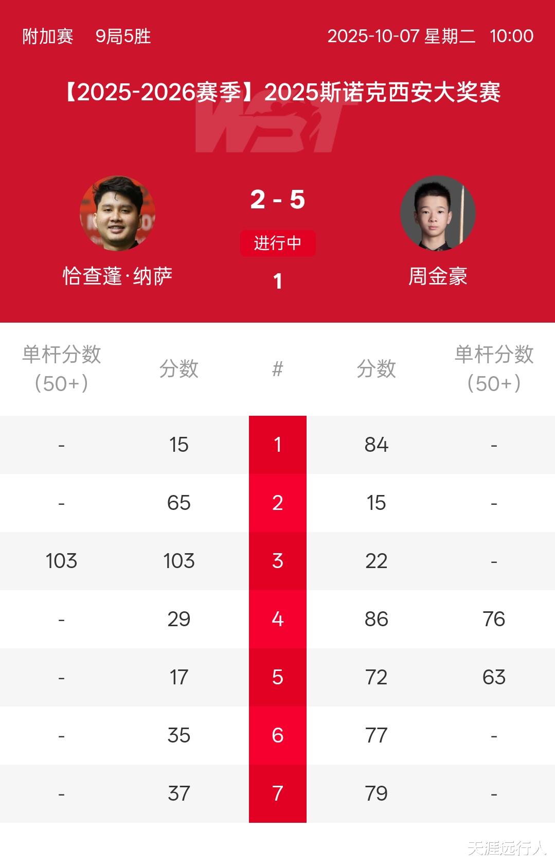 北京时间10月7日13时52分,2025斯诺克西安大奖赛正赛阶段首个比赛日,上午场预选轮(129进128轮次)一场、延期资格赛(128进64轮次)三场、正赛首轮64进32轮次的三场(袁思俊对杰米·琼斯的一场,琼斯退赛,袁思俊不战而胜)。