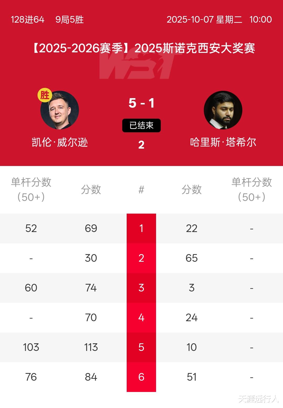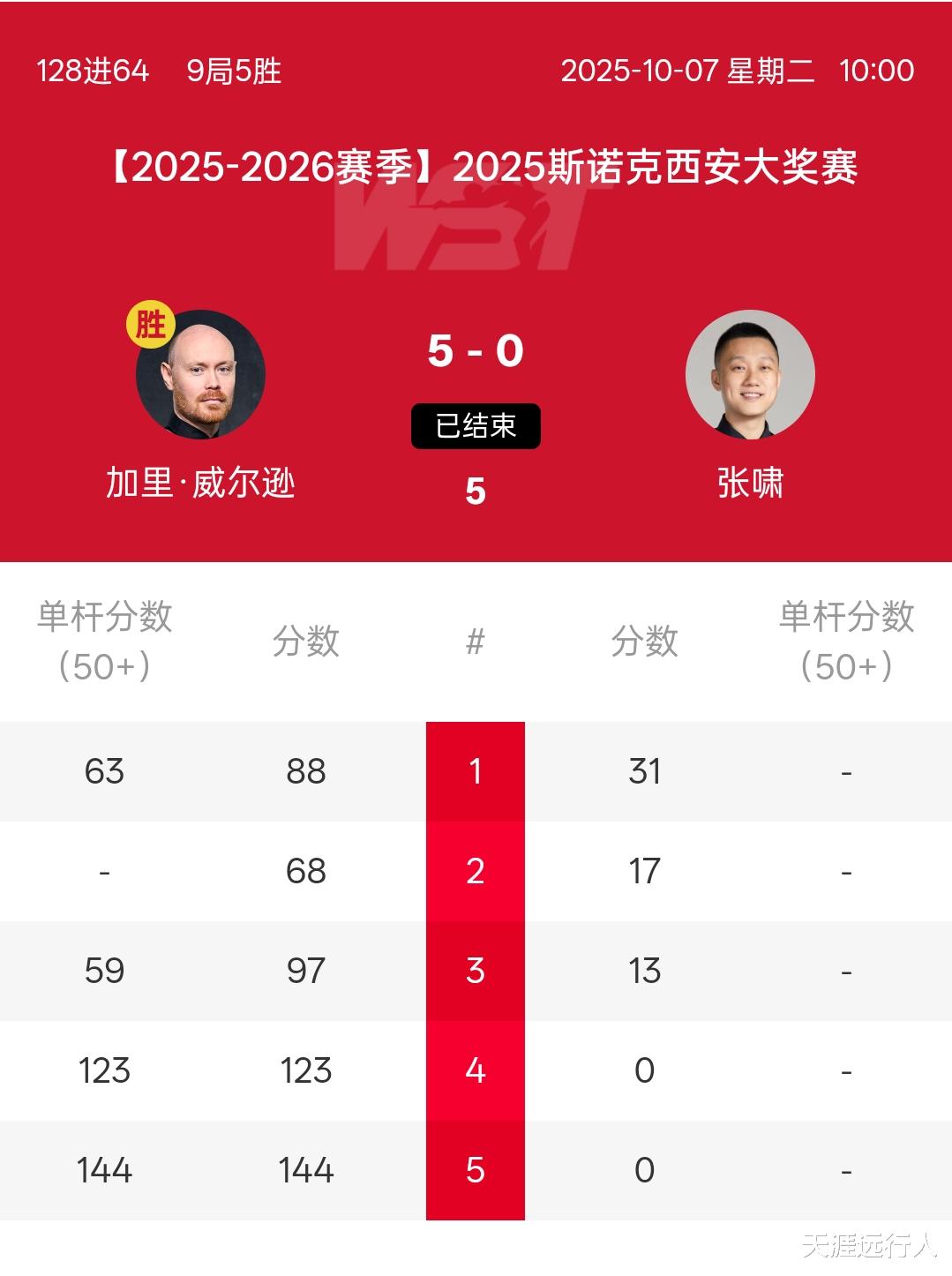 本赛季武汉公开赛亚军、上一站英国公开赛打出147满分杆的加威打出123、144两杆破百和两杆单杆50+,一波五连鞭横扫西安大奖赛外卡选拔赛亚军、来自上海的张啸,强势晋级32强。