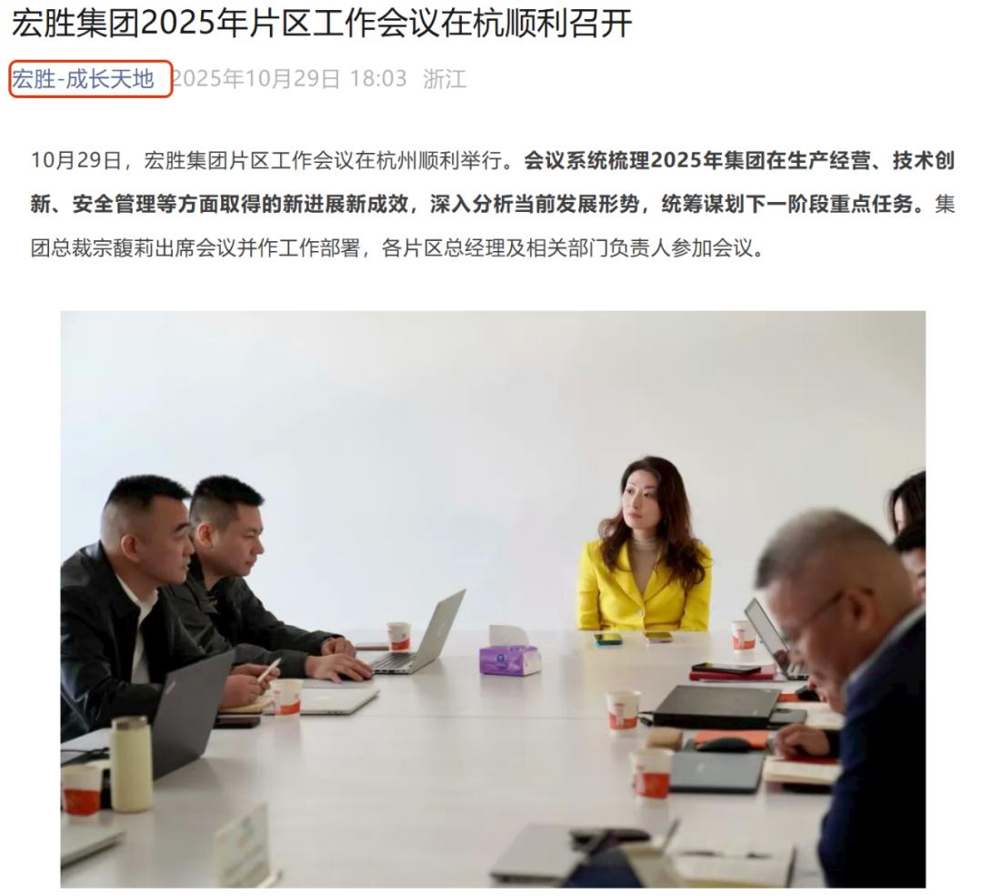 宗馥莉在今年遭遇了辞任又重新掌权,再度离职到再回归等一系列变故。40多天前宗馥莉辞任董事长,据宏胜集团旗下公众号“宏胜-成长天地”10月29日消息文章显示,10月29日,宗馥莉出现在宏胜集团片区工作会议现场。这是她向娃哈哈集团辞去法定代表人、董事、董事长等相关职务后的首次公开亮相,不过这一次,她不再是娃哈哈的掌舵者,而是以宏胜集团总裁的身份主持会议。