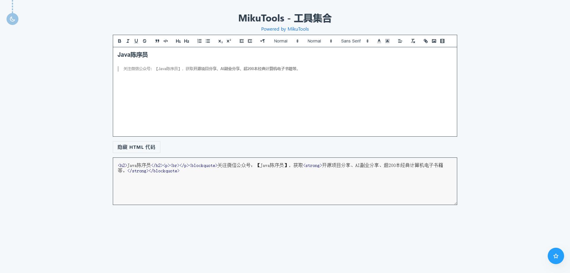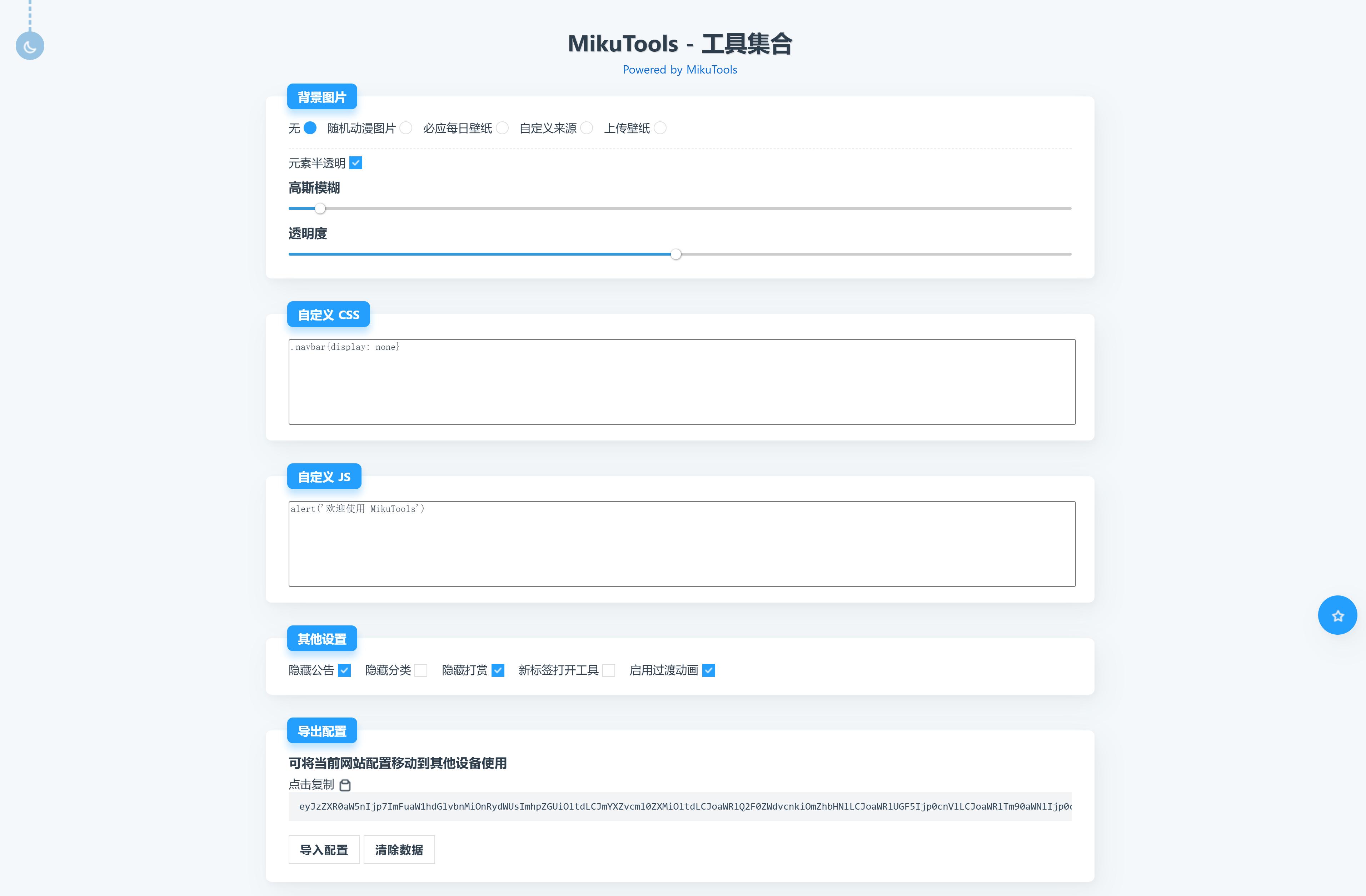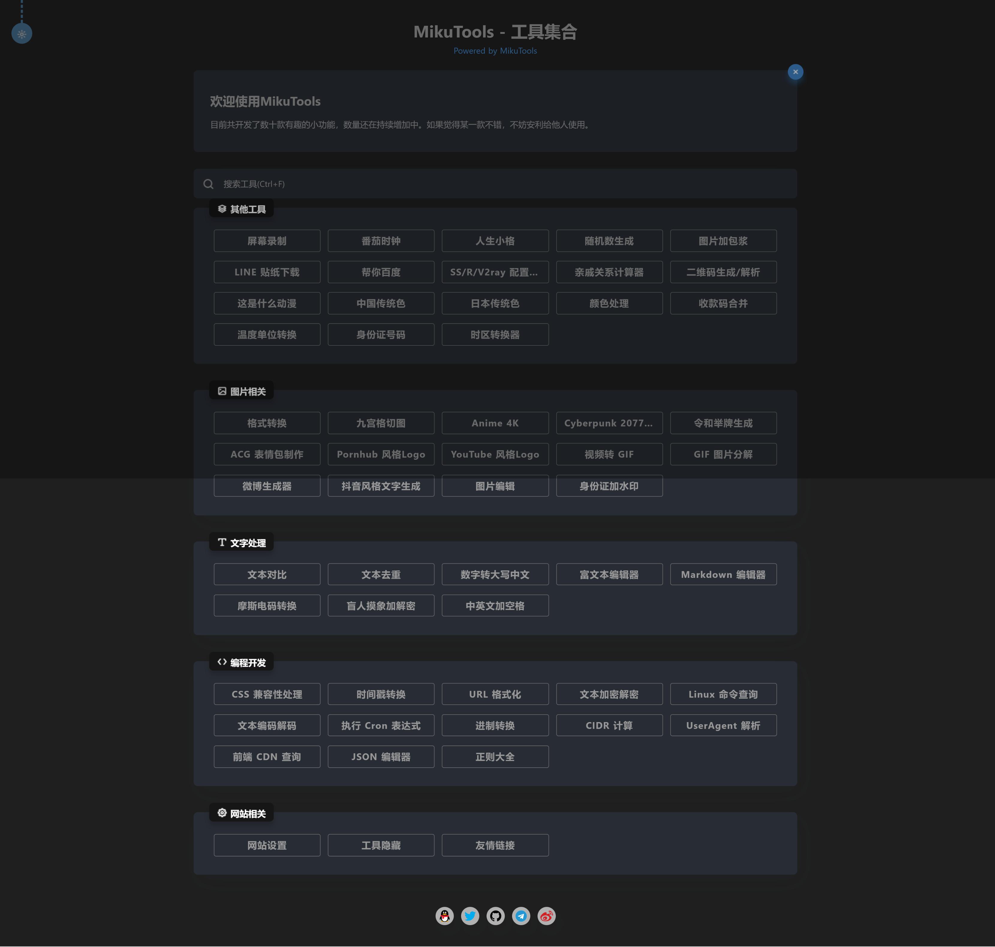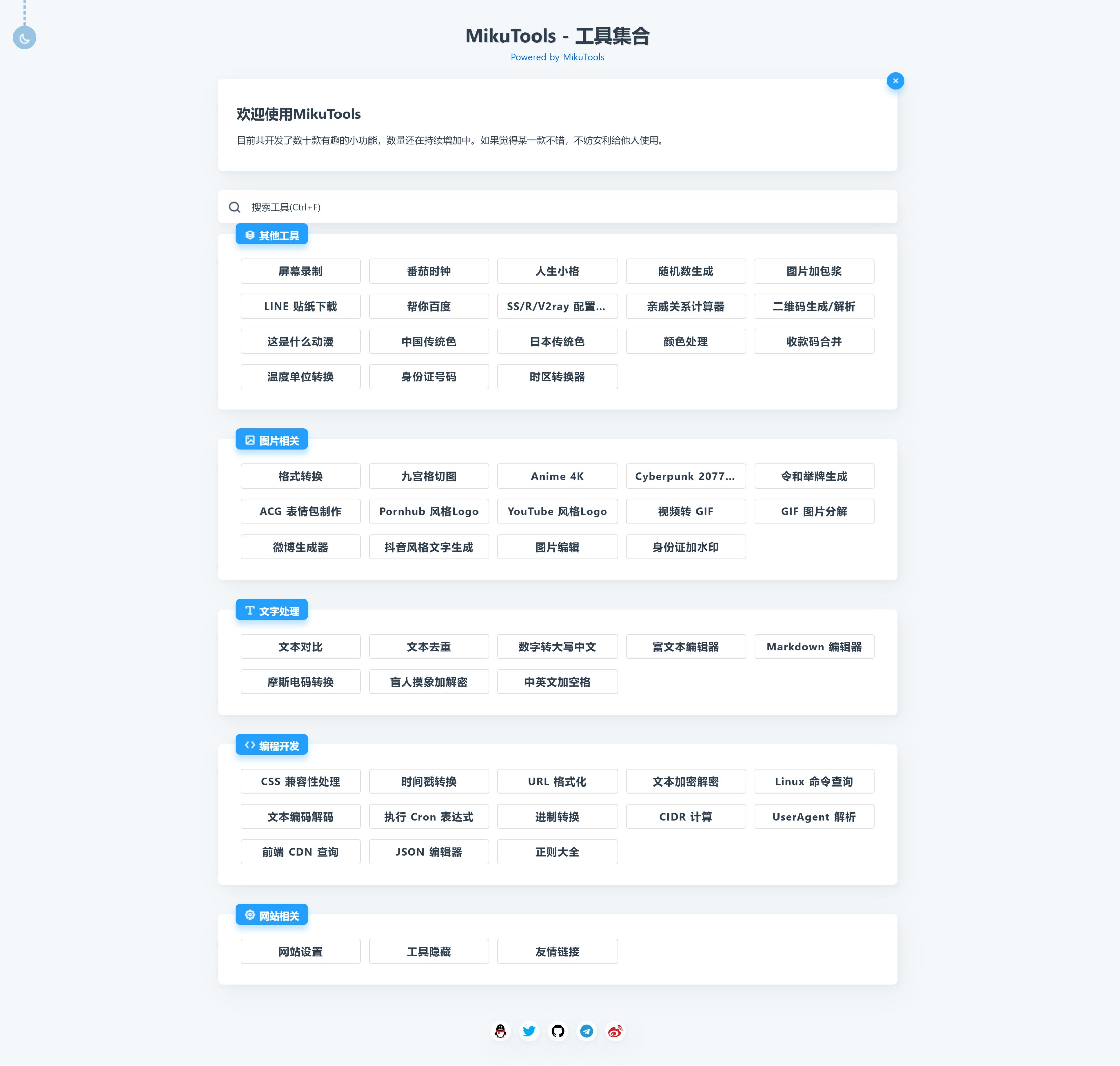 项目介绍MikuTools —— 一个开源的在线工具集合,开发了图片处理、文本转换、编程开发等数十种工具。采用 Vue 全家桶 + Nuxt.js 技术栈开发,界面简洁清爽,操作简单直观。
